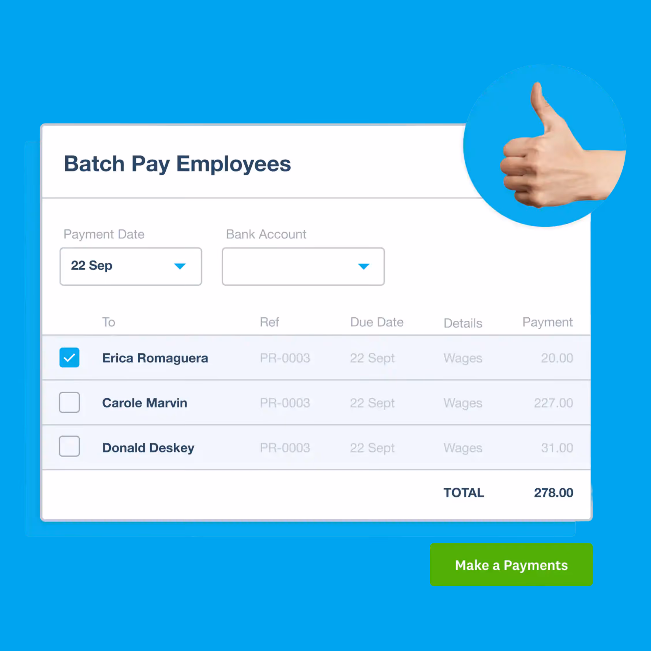 Keep basic pay records online, complete pay runs for a small number of employees using Xero, and run payroll reports.